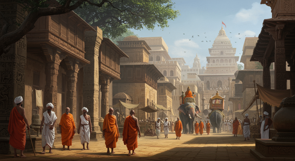“A grand scene at the bustling city center of Pataliputra during the Mauryan Empire, around 250 BCE, with citizens in cotton dhotis and turbans, Buddhist monks in saffron robes, elephant caravans, Ashokan pillars inscribed with edicts, and wooden structures with intricate carvings, historically accurate, realistic, soft morning light with a hint of mist.”