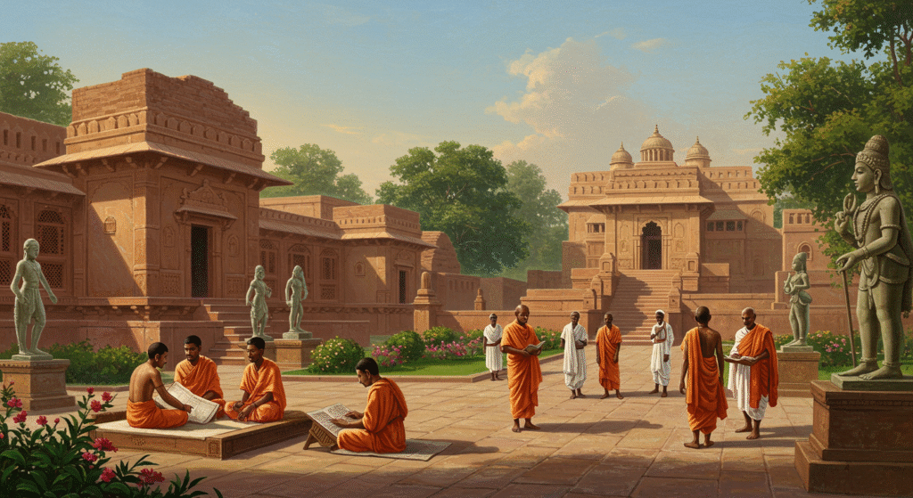 “A scholarly gathering at a university complex in ancient Nalanda during the Gupta Empire, around 400 CE, with students and monks in simple robes, palm-leaf manuscripts, sandstone buildings with ornate carvings, lush gardens, and statues of Hindu and Buddhist deities, historically accurate, realistic, golden afternoon light.”