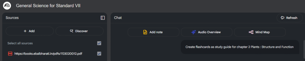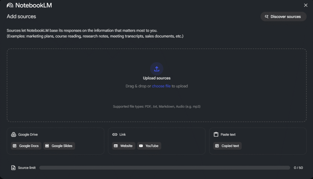 After clicking on “Create New”, NotebookLM will show you the following screen – you can either click on “Website” and put the link for your text book or you can click on “Upload sources” if you already have the book on your computer or Google Drive