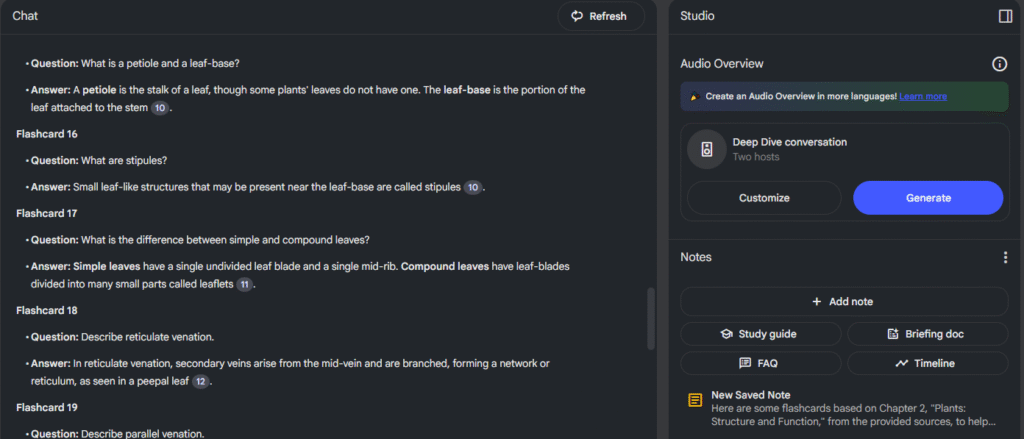 After it has created the flashcards, scroll down and click on “Save Note” – Your flashcards will be saved as a note on the right side panel.